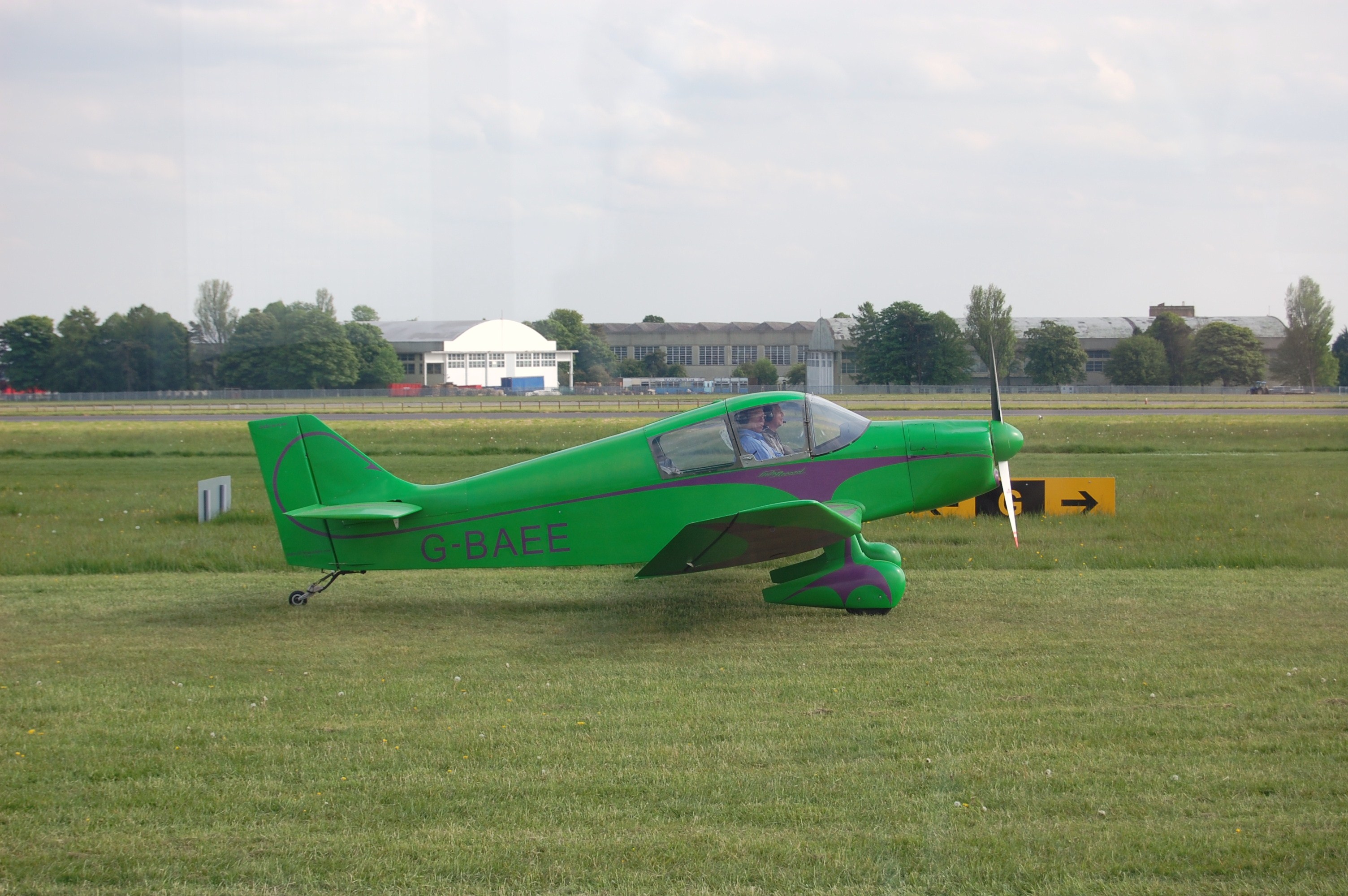 The aircraft you see here is a very colourful example of the Jodel DR. 1050-M1 ‘Sicile Record’, taxying at GVFWE, Cotswold Airport, Kemble. This four-seater is powered by a Continental Motors Corporation O-200 engine driving an EVRA propeller, and was once on the French Civil Register as F-BMGN until 1972. It was built in 1964, under licence by Centre Est Aeronautique, an aviation company under the direction of Pierre Robin. Jean Delemontez worked closely with Pierre Robin to produce a specific series of Jodel designs; indeed, the prototype DR.1050-M1 was originally constructed as a DR.100A in 1958, then converted to the later standard in 1962. The aircraft name commemorates the fact that Pierre Robin, flying a Jodel, won the Round Sicily Rally in 1964 at an average speed of 162mph – although the external door handles had been removed, and the door/fuselage gaps sealed with tape to reduce drag!