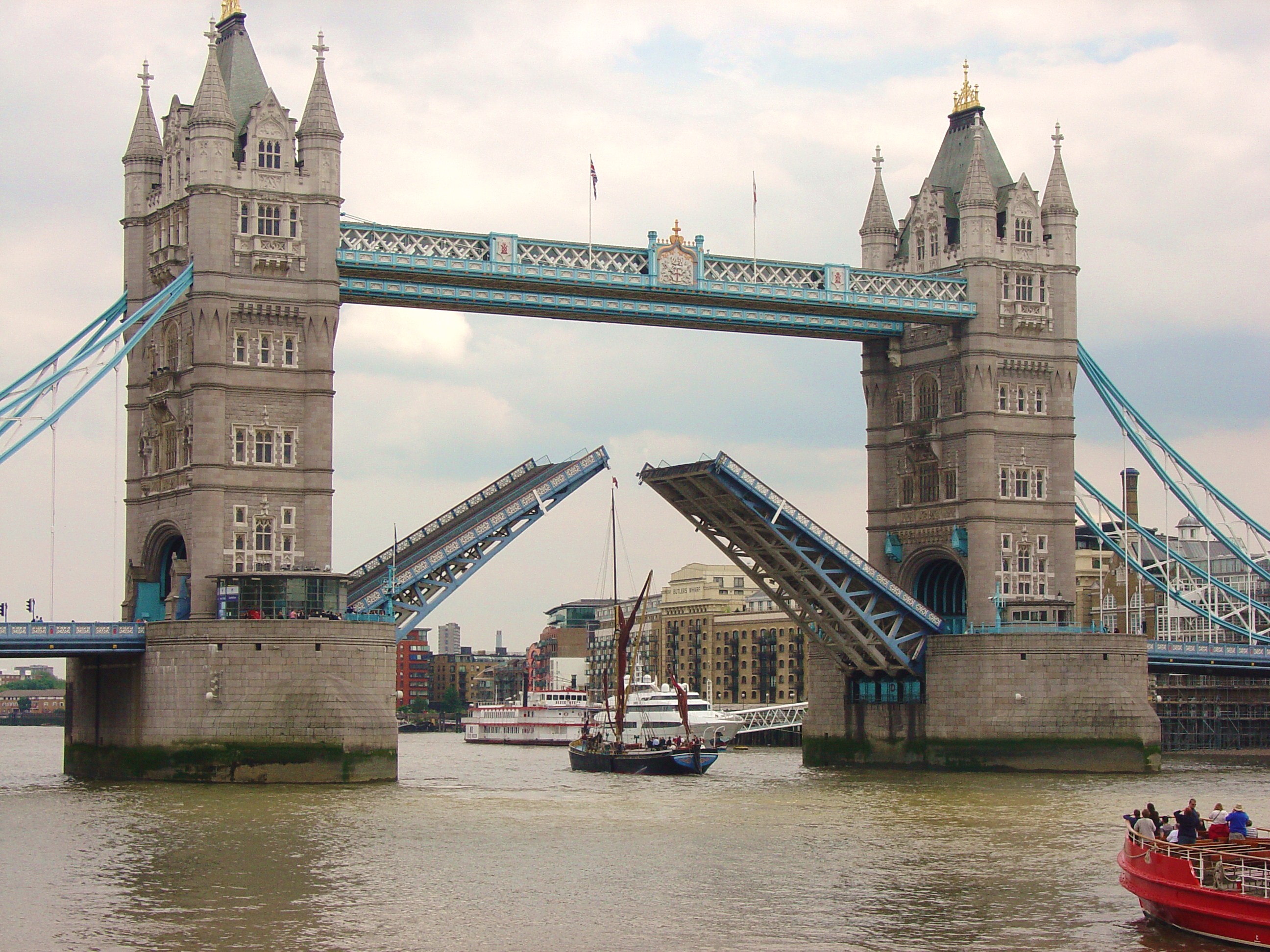 Here we can see a fine example, moving through the center, No. 2, arch of Tower Bridge from the Pool of London, where HMS Belfast is moored. Tower Bridge is, technically, a bascule bridge – one with ‘leaf’ sections as well as a suspension bridge, and is one of the most iconic bridges in the whole world. Officially opened in 1894 by the then Prince of Wales (later Edward VII), it is still in heavy use today by road and foot traffic, although ships have to give 24 hours notice to have the bascules raised.