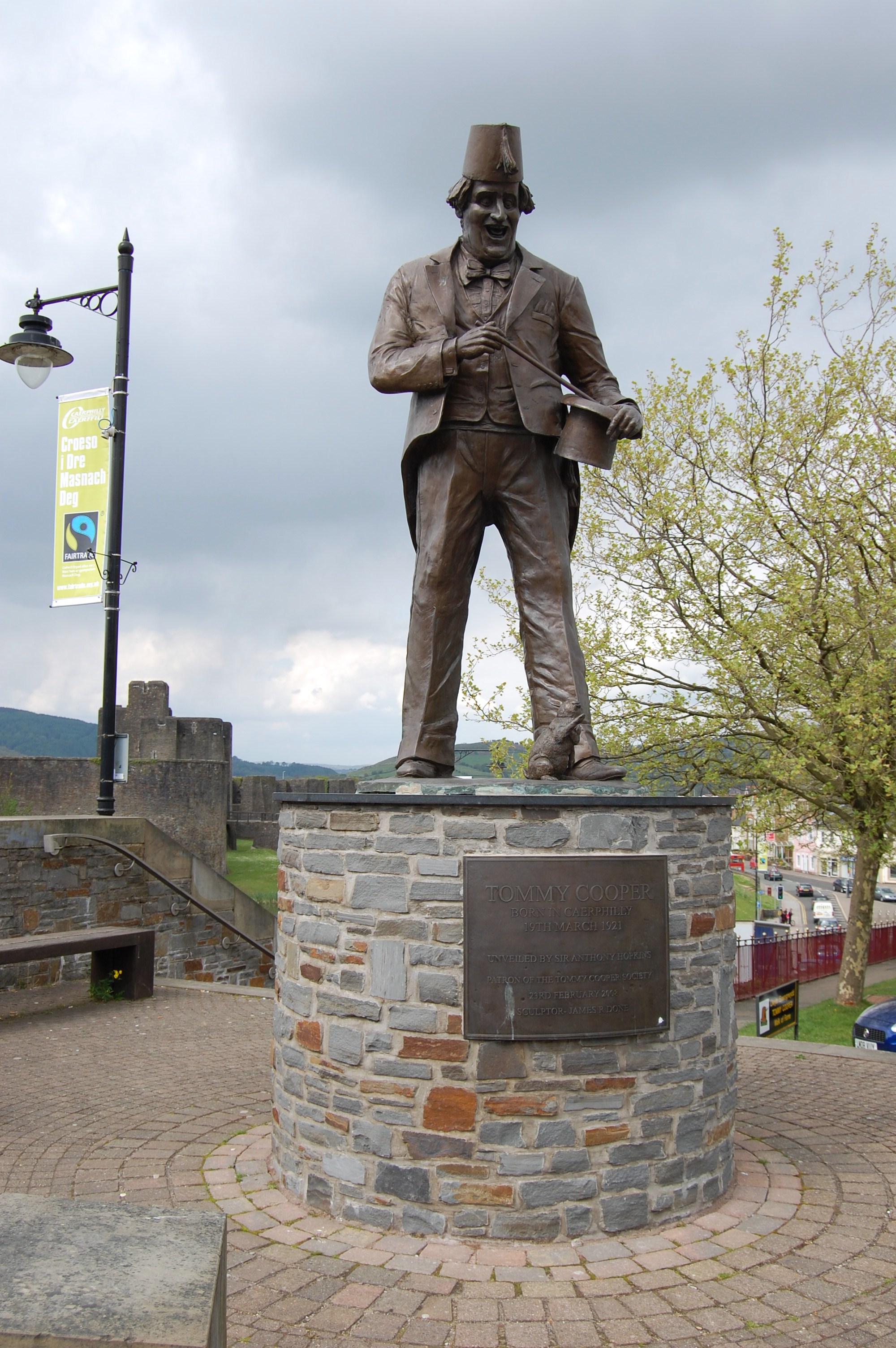 In the center of Caerphilly stands an appropriately larger-than-life bronze statue of its favourite son; sculpted by James R Done, at a cost of £45,000, it is 9 feet tall, which is in keeping as, at 6 feet 4 inches tall, Tommy Cooper stood head and shoulders above most of his generation. It was unveiled on 23rd February, 2008 by Oscar-winner Sir Anthony Hopkins, the Patron of the Tommy Cooper Society; Sir Anthony got into the mood by wearing an Egyptian-style fez (Tommy’s signature headgear) and a daffodil buttonhole (the national flower of Wales).
