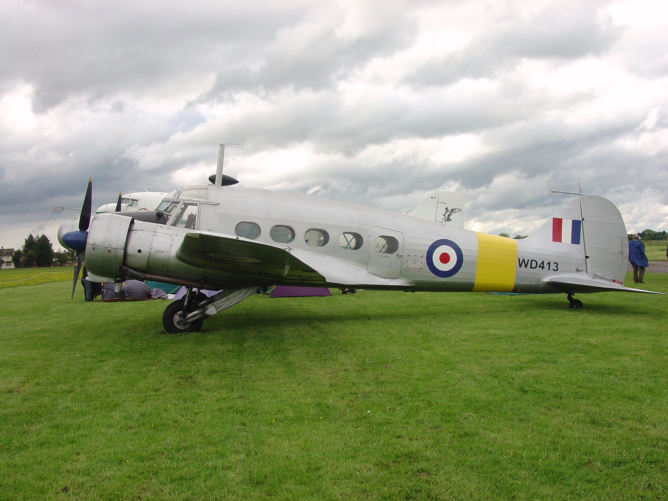 Here you can see Air Atlantique’s Vintage Flight Anson T. Mk 21, WD413, (G-VROE) in typical RAF colour scheme for ‘second-line’ aircraft (training and communications types) of all-over silver with yellow bands, parked at the Great Vintage Flying Weekend at Hullavington, Wiltshire. The Anson T.21, designed as a navigation trainer to Specification T.25/46, first flew in prototype form in May 1948. WD413 was ordered from Avro as part of a small batch (WD402 – WD418) making up a total of 252 of this sub-type which were all taken on charge by RAF Flying Training Command, although some ended their days in Communications Squadrons. The very last Ansons were withdrawn from RAF service at RAF Bovingdon on July 1968, following a formation flypast by five C.19 and one T.21 aircraft. Oh, to hear 12 Armstrong-Siddeley Cheetah engines trundling by!