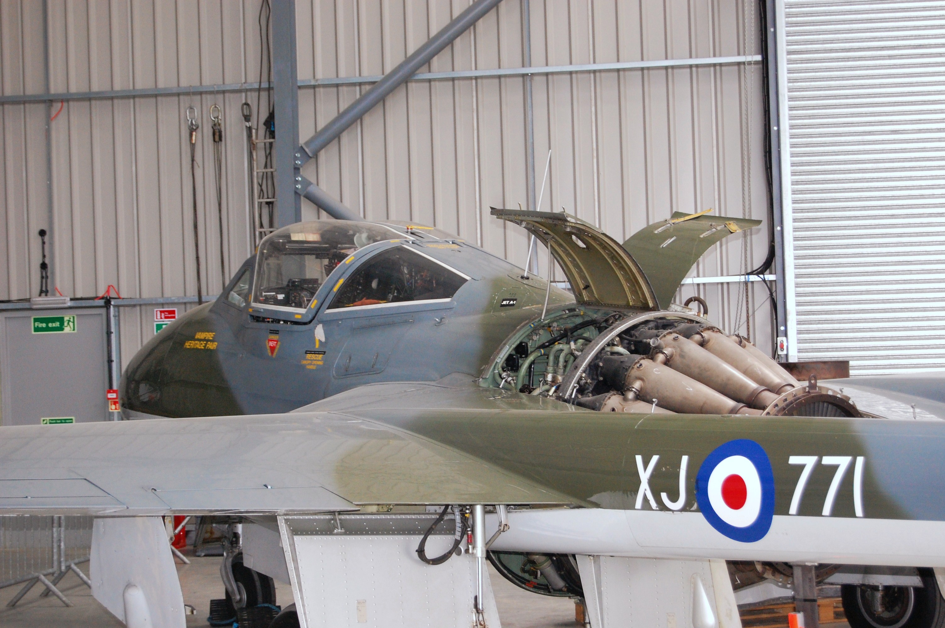 The Vampire is shown in the Delta Jets hangar at Cotswold Airport, Gloucestershire, where it was undergoing routine maintenance. Delta Jets, as well as managing a fleet of classic jet aircraft for various owners, is a Beechcraft distributor, and as such has a wealth of experience when it comes to maintaining aircraft such as the Vampire. The access panels over the DeH Goblin Mk. 35B have been opened, and you can see the can-type combustors (there are 16), and, since the jet pipe and tail cone have been removed, you can see the blades of the single-stage turbine. The flaps are fully down under the wings, and it is obvious that XJ771 is in the middle of several systems checks.