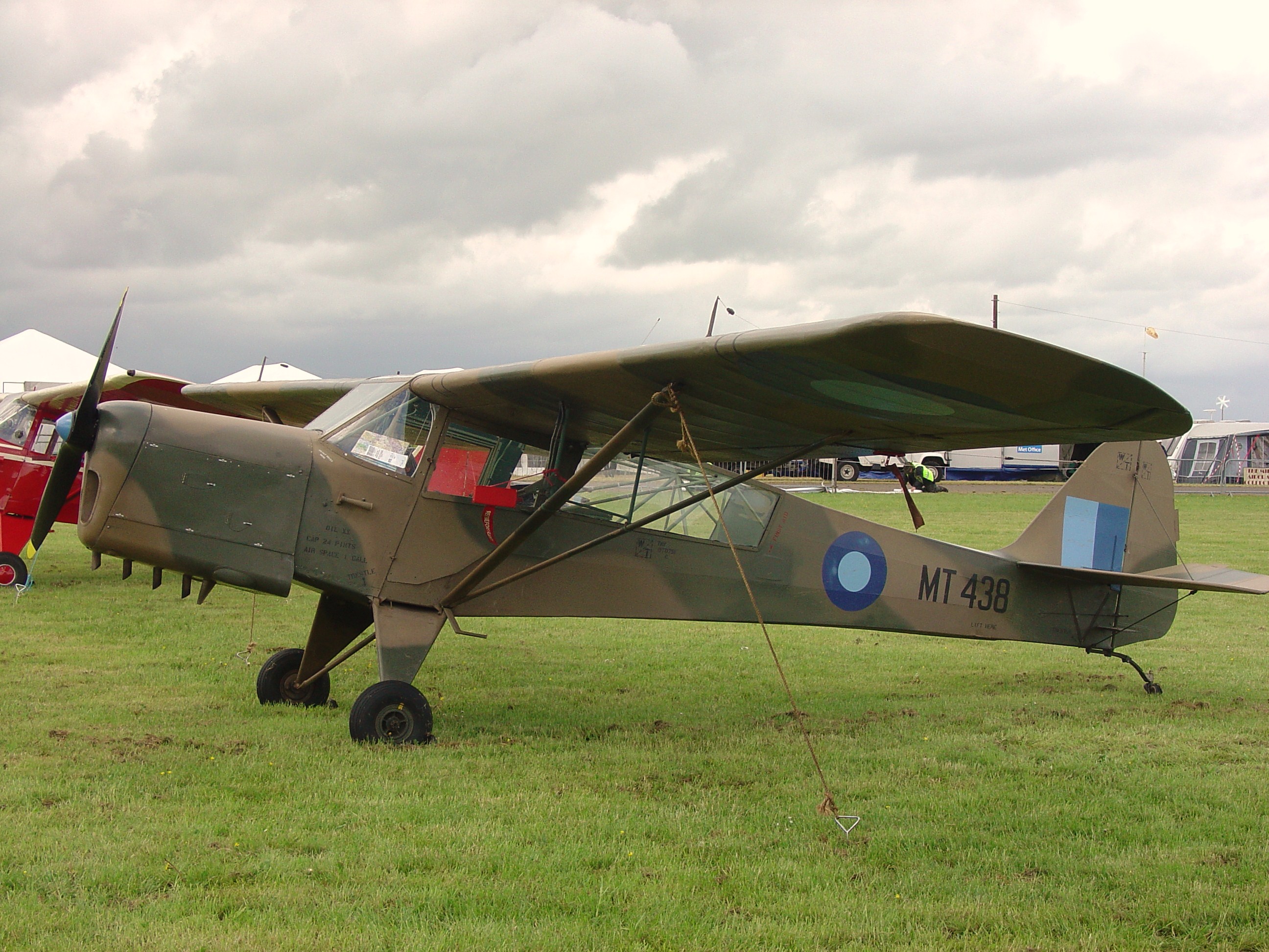 Here we can see an excellent example of the Auster III, MT 438, formerly of No. 656 Sqn., RAF; she is at the former RAF Hullavington, and is well secured with screw pickets under each wing, against the coming storm. MT438 is in typical SEAC camouflage scheme – Dark Earth/Dark Green on all surfaces, with roundels and fin flash being painted in Light Blue/Roundel Blue. This removal of all traces of red from the national markings was to prevent any confusion with the Japanese hinomaru (and thereby minimize ‘friendly fire’ incidents).