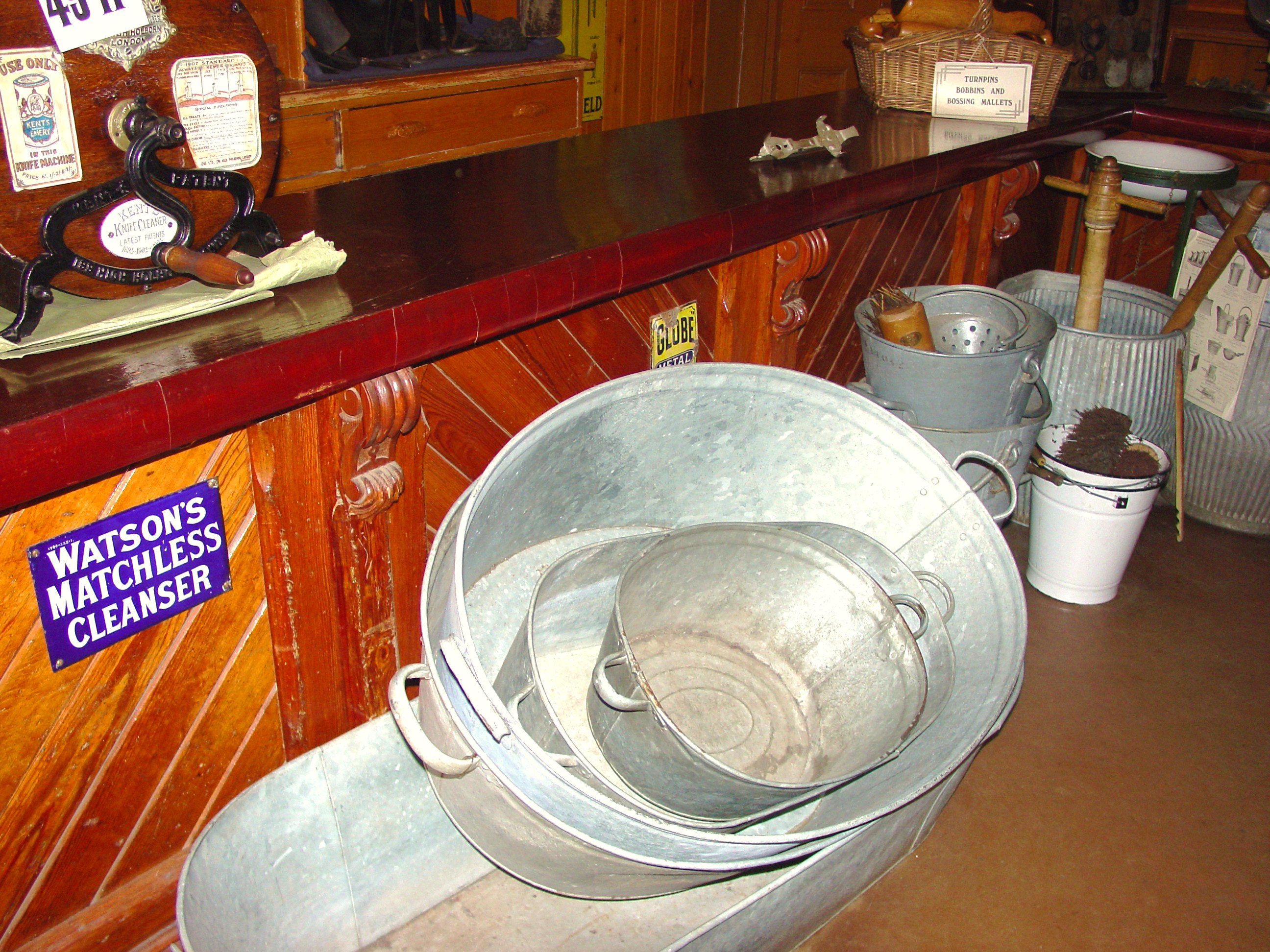 Tags: 'hot-dipping', 'moleskin' trousers, 'tin baths', 'tin baths' became redundant, 1913 community, a 1913 community, a form of heavy brushed cotton, advent of 'pithead baths', against the sales counter, Annfield Plain Co-operative Store, array of galvanized items, back garden, bath used by a miner, bathing a baby, bathrooms and washing machines, Beamish, beaten to loosen the coal dust, brick by brick, clothes would be agitated in warm soapy water, Co-op hardware store, coal miners coming off shift, coal mining, coal-fired domestic grate, coating with a layer of the metal zinc, cotton vest, dipped into a bath of molten zinc, dirty clothes, dolly, dolly tubs, Durham, electrical current, electro-deposition, electro-plating, electro-plating gives a brighter finish, electrodes, England, flannel shirt, galvanized bathtub, galvanized steel 'dolly tub', galvanizing, Great Britain, greater protection to the steel, hand-washing clothes, hardware section, hot water from the side-boiler of the coal-fired domestic grate, hot-dipping gives a thicker duller coat, Luigi Galvani, modern plumbing, museum, Museums, North of England Open Air Museum, Northumberland, Northumberland and Durham, passed through a zinc-containing solution, plate with zinc, primitive forms of washing apparatus, re-erected at Beamish, recycled as planters for flowers, rust-proofing a mild steel object, shedding their coat and trousers, stacked on the floor, the North of England Open Air Museum, underwear, used for everything from hand-washing clothes to bathing a baby, varied from region to region, Victorian, Victorian/Edwardian life, walk home in their 'pit dirt', warm soapy water, wash off the coal dust, washing machines, wooden 'T-handled' implement, wooden projections, zinc coating