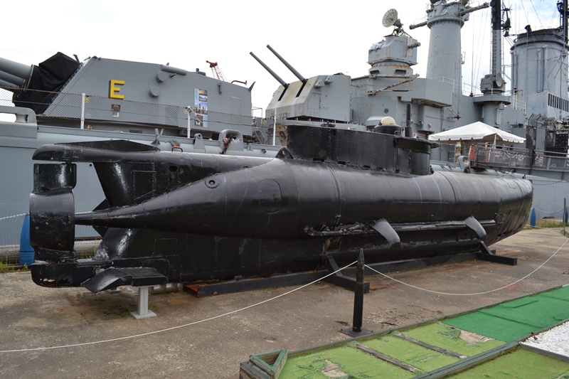 Here you can can see a portion of the USS Salem in the background of the photograph, showing one of the triple 8″ gun turrets, and ahead of it, one of the twin 5″ turrets. However, the black object in the foreground is what I had come to see! Despite the lack of any markings, the size of this submarine, and the distinctive side cradles for an externally carried torpedo on each side give it away – it is a ‘Seehund’ Type XXVIIB, one of Germany’s ‘last-ditch’ weapons of WW2.